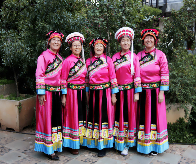 左起 ——雪柔、蘭馨、建荣、安庆、雪莲花。此行的五朵金花。其实更应该称阿诗玛,才能对应上后面的阿黑哥
