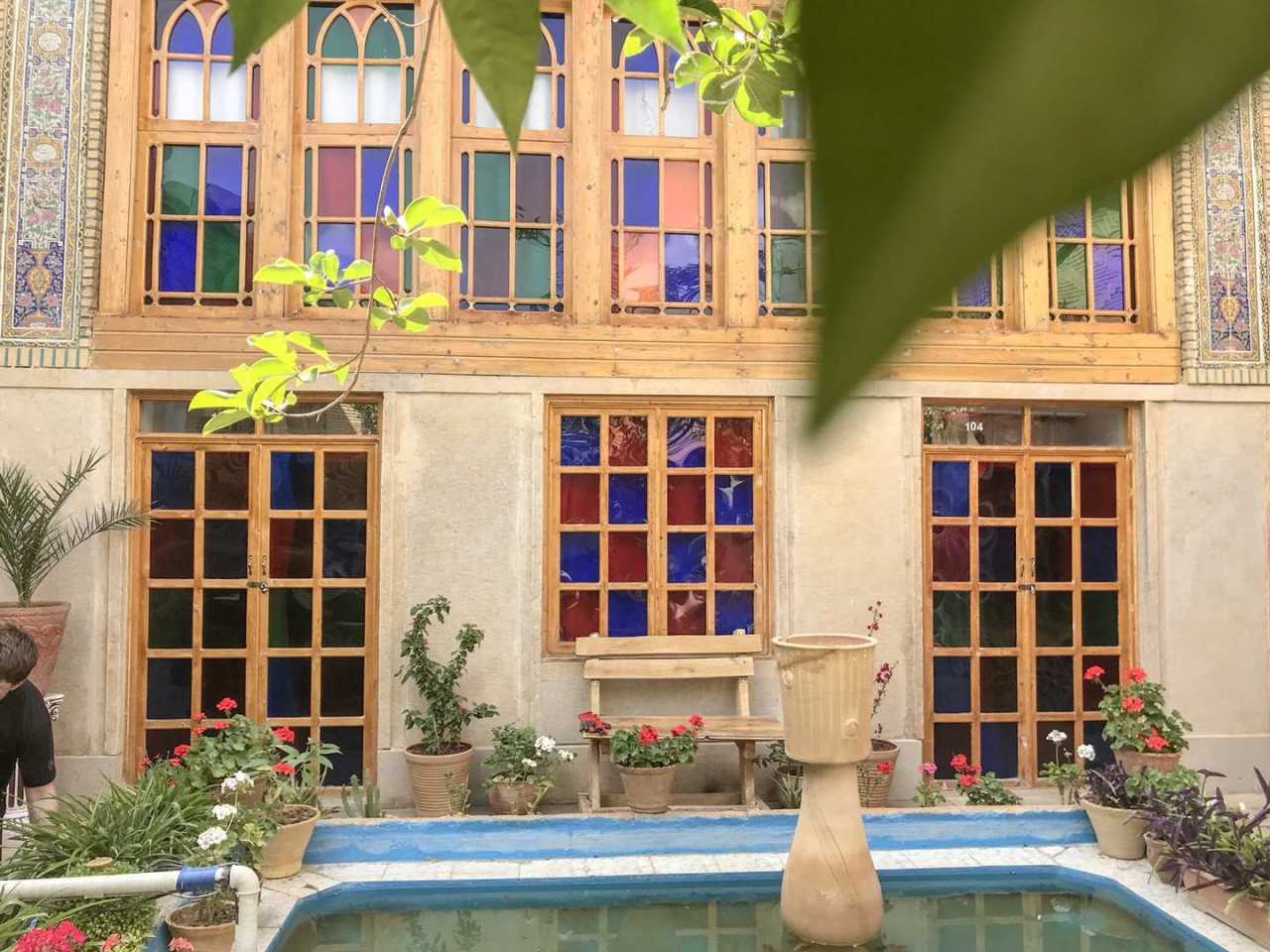好不容易找到了这家青旅, 一进去的感觉就是:哇:这里也太美了吧。这是伊朗传统的庭院,玻璃窗是彩色的,中间有一个水池,周围有一些坐榻, 还有好多植物。