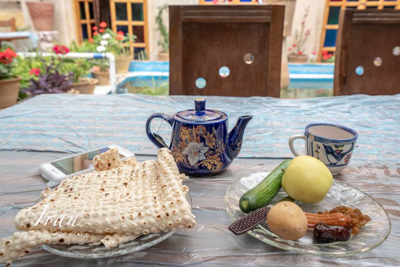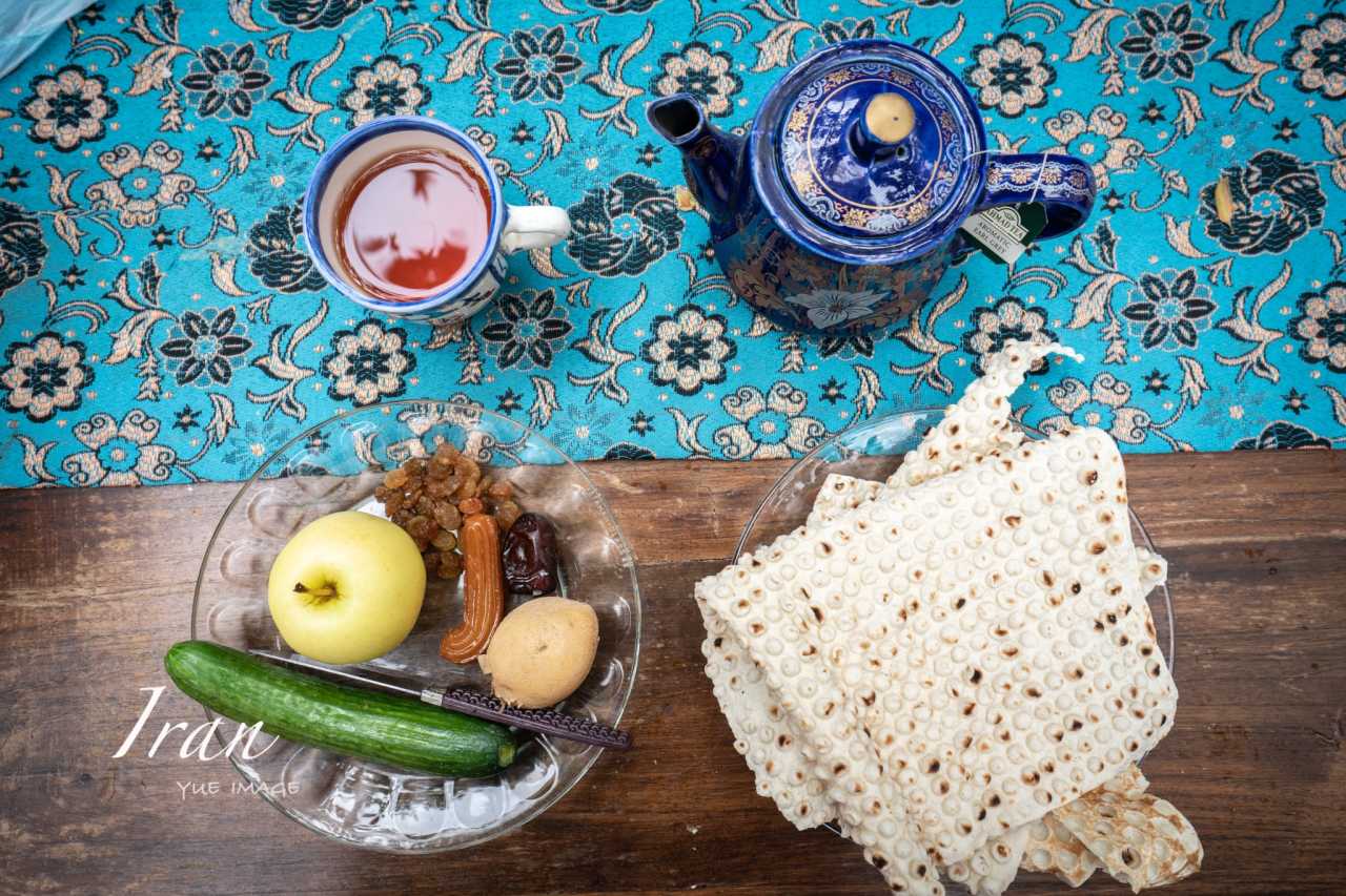 一坐下来,顿时就不想动了。 一个微胖的伊朗哥们给我端上来一盘水果,还有伊朗传统甜点,红茶,还有伊朗的饼什么的,说:you look tired, 这待遇简直太好了吧,忍着饥渴拍了照再开吃。 而且我好喜欢这些伊朗风的桌布呀。