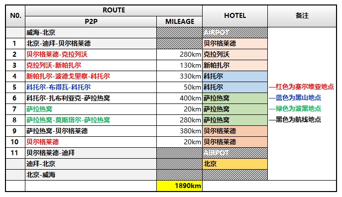准备过程中,按照习惯罗列了基本的路由表格,方便评估路线长度和订阅住宿。