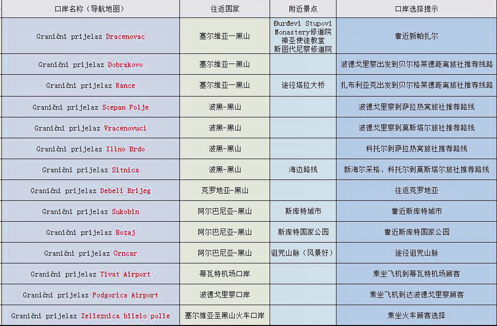 D. 自驾/包车:进出黑山的关口+出入境日期。黑山主要关口信息如下:
