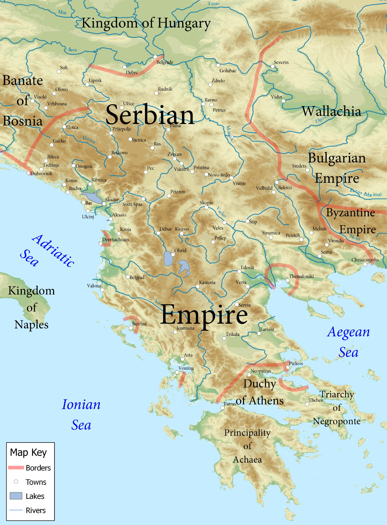 ——公元1331-1355年,国王 斯特凡•乌罗什四世•杜尚 在丘斯滕迪尔附近击败保加利亚,征服希腊北部并模仿拜占庭帝国颁布了《斯特芬·杜尚法典》,塞尔维亚帝国形成。