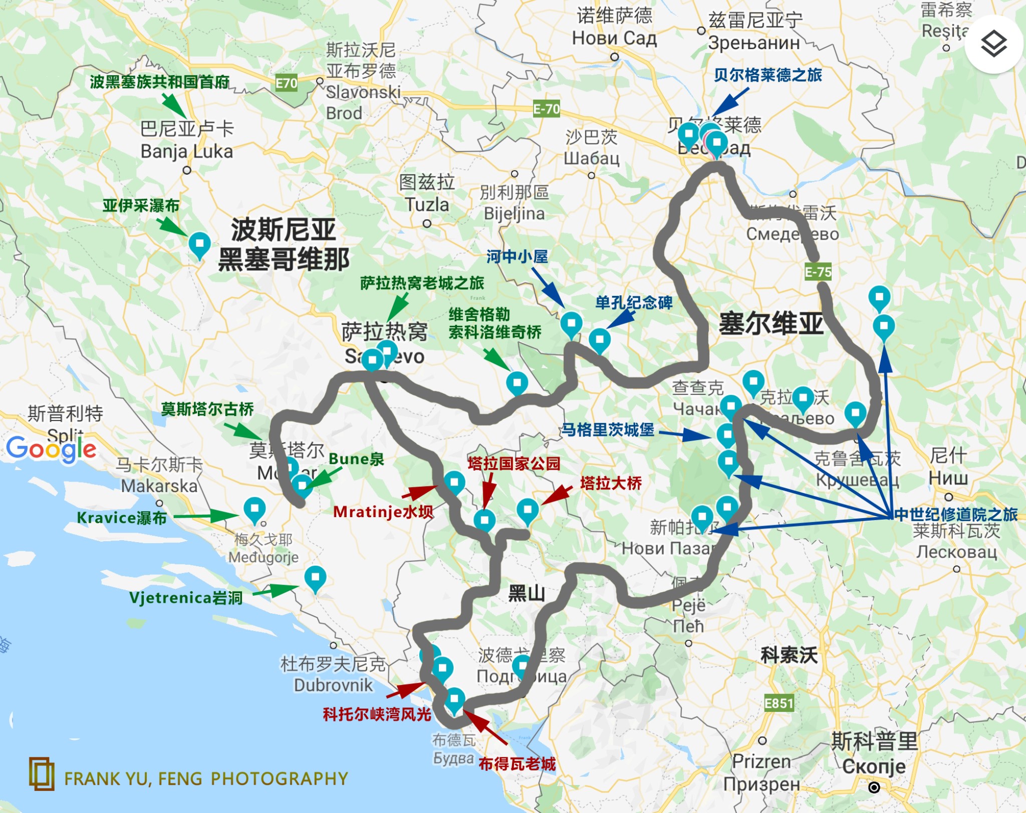 这条路线为顺时针环形闭环线路,从塞尔维亚的贝尔格莱德出发,转一圈再回到贝城,跨塞尔维亚-黑山-波黑三国,采用自驾形式,10天9晚,全程约1900公里。