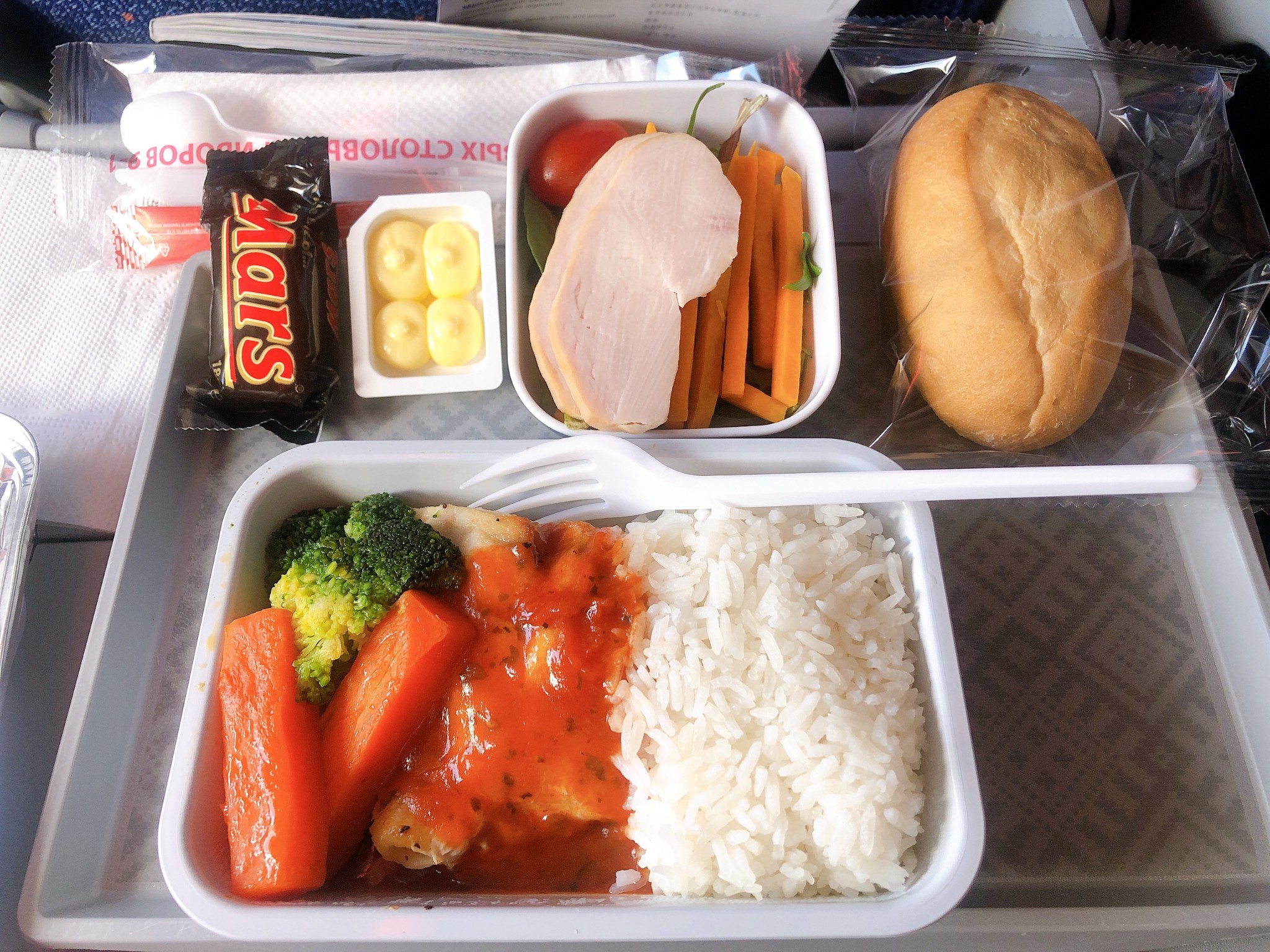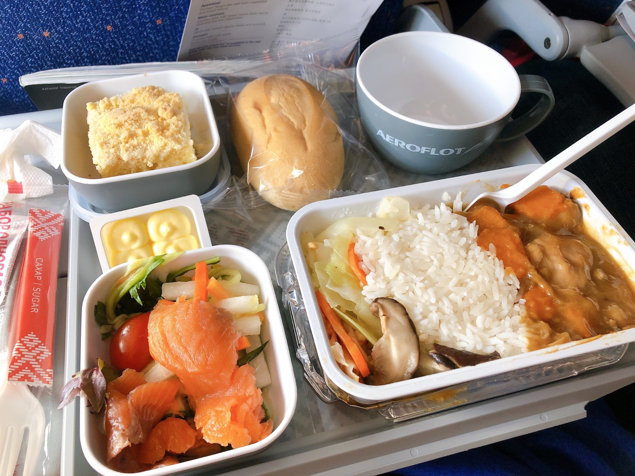 长途客机经济舱是真的难受,这趟航班像是加座的感觉,很拥挤的3-4-3布局,座位间距很小。午餐提供两种选择(鲈鱼或鸡肉),三文鱼凉拌腌蔬菜作为前菜,胡萝卜炖鸡肉配米饭,黄油小餐包,还有饭后甜点小蛋糕(很甜),因为人多来不及的原因,吃完饭空姐才有空分咖啡和茶。