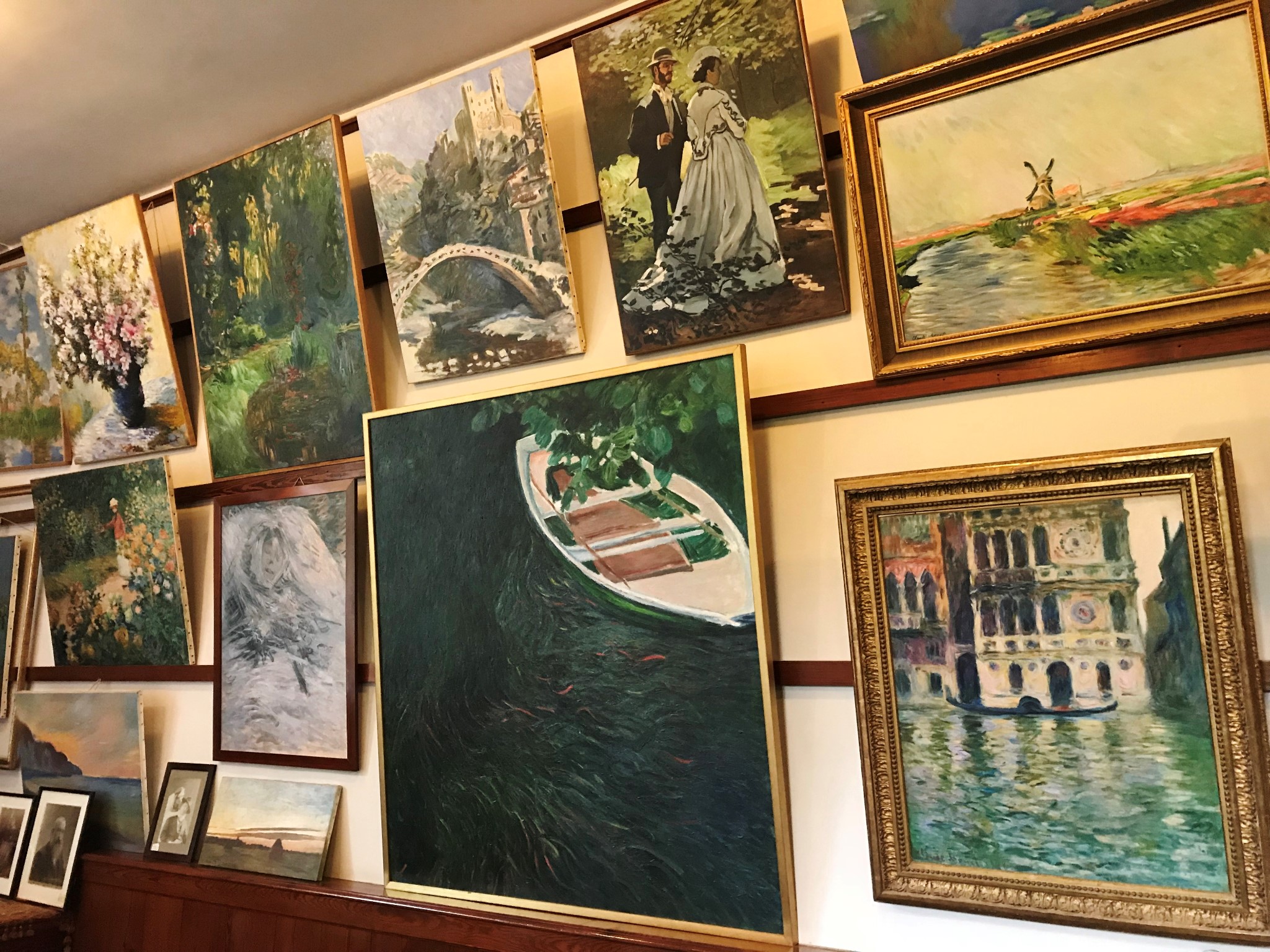 莫奈故居的装饰色彩柔和、典雅清新。步入一楼的客厅,只见墙上悬挂着、桌上摆放着大量莫奈作品的复制品。