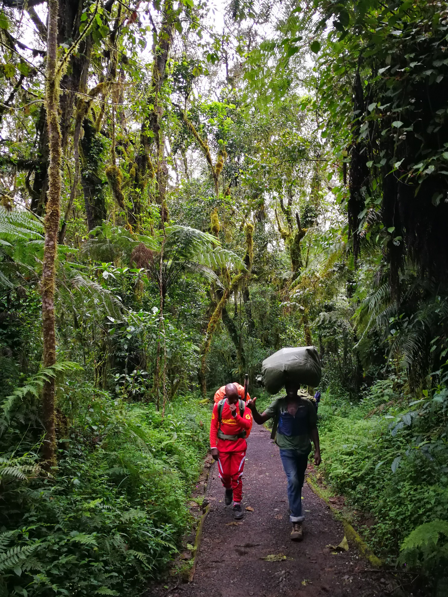选择的MACHAME六天五夜的路线,第一天的半日路程算是春季的原始的雨林中,树木保护的很是到位,还有小溪流的水向导和挑夫们直接饮用,徒步的时间三百多分钟到达驻扎的营地。