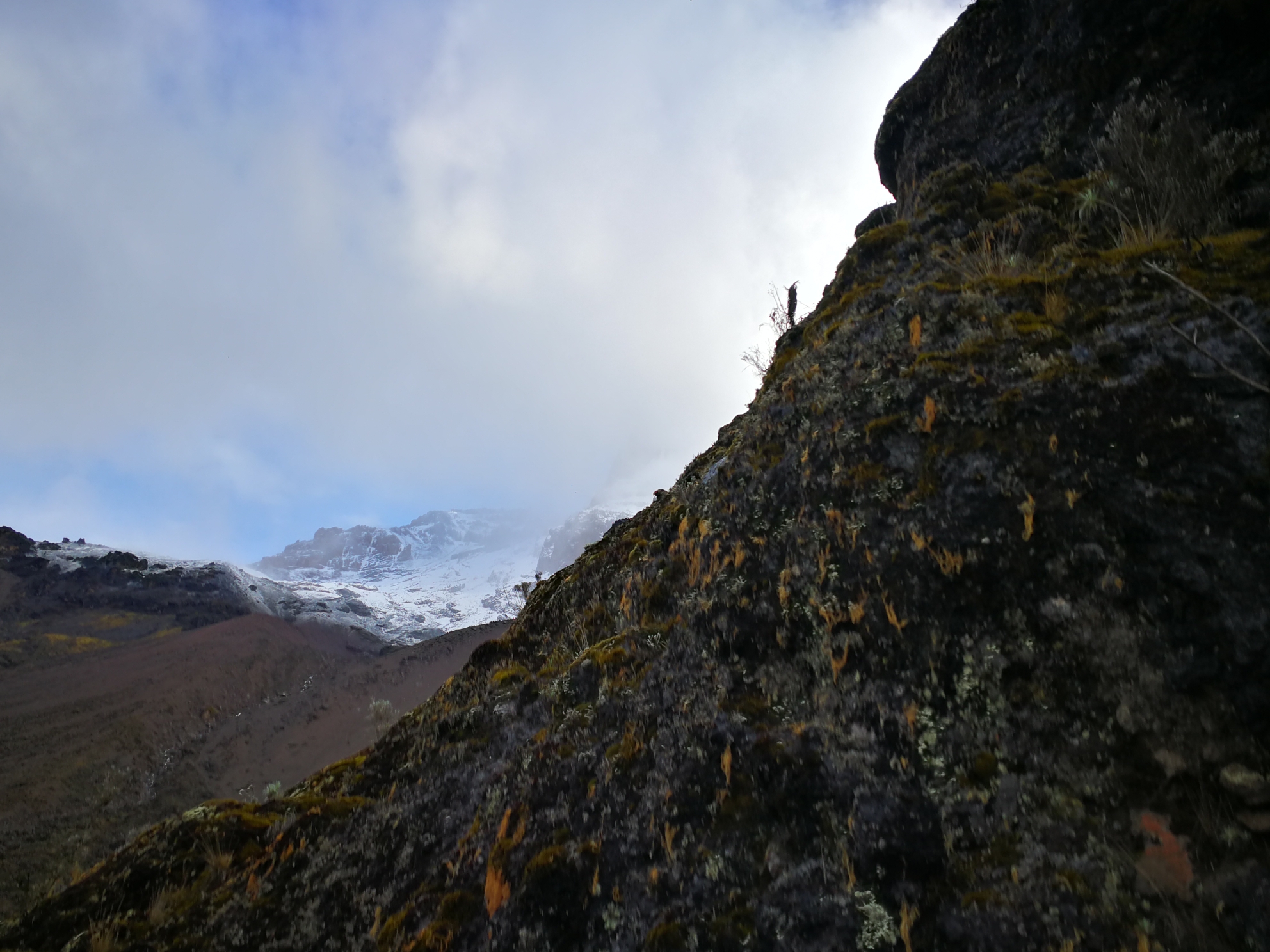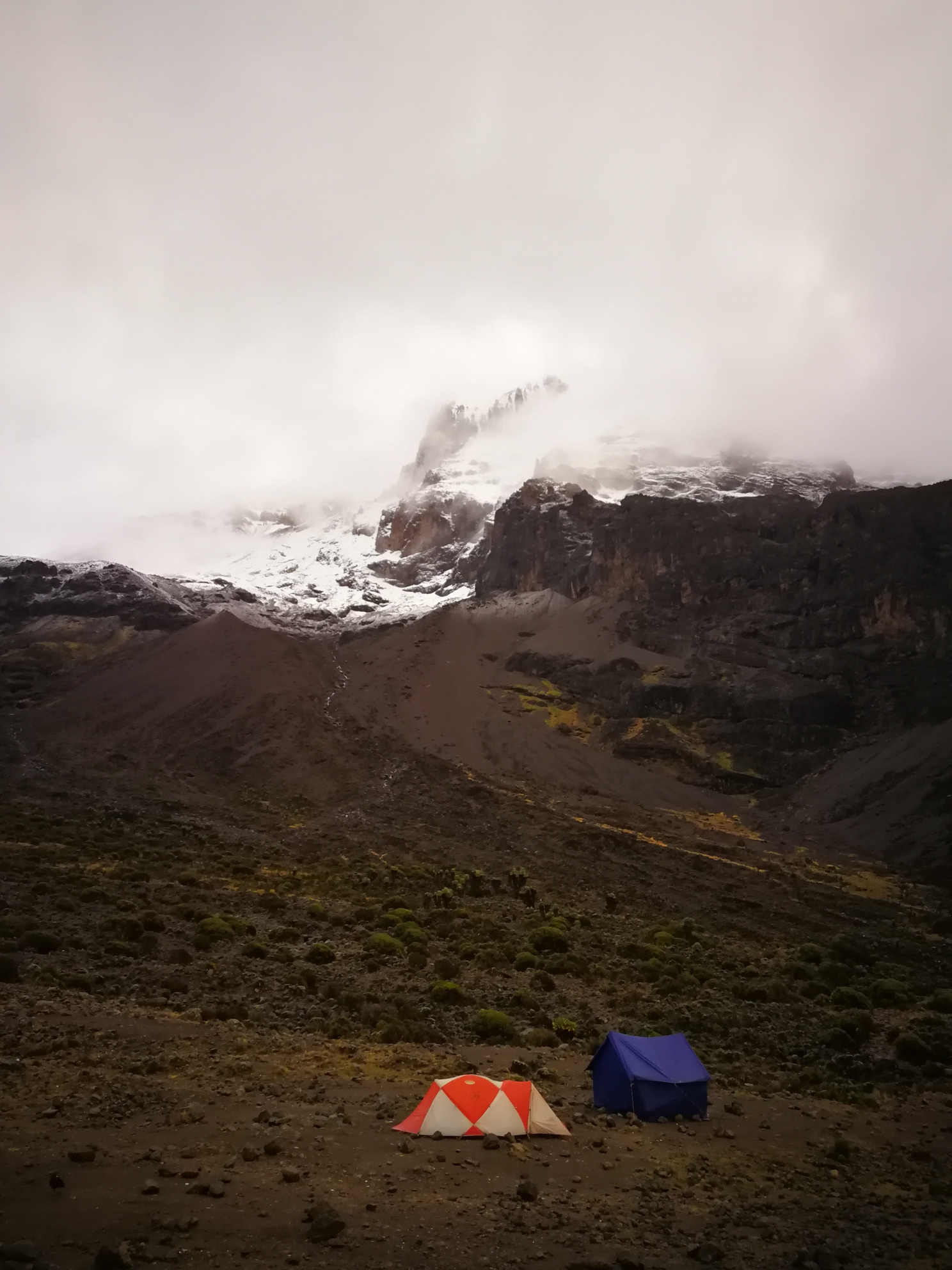 第四天的清晨出发的时候顺着岩石圈向上攀爬,此日的行程难度较大,需要有一定的体力和锻炼。路程比较长一直徒行至Barafu营地驻扎,提前晚餐休息为了凌晨后的冲顶做准备,傍晚时分飘起鹅毛大雪。