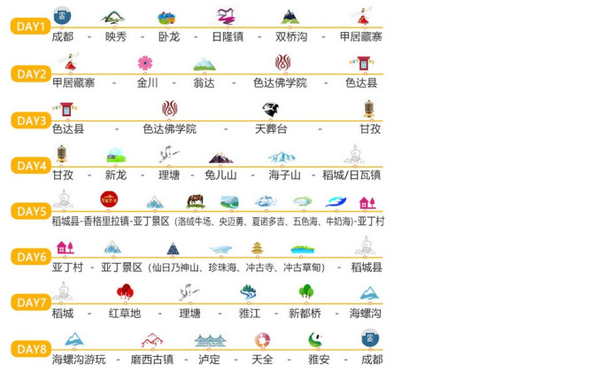 8天川西大环线,涵盖了我计划中想去的四姑娘山、色达佛学院、稻城亚丁、海螺沟,而且据说这条环线路上的风景也超赞,可以翻越许多座雪山,期待吧~