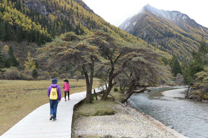 这里是两山间一片开阔草滩,可能是由于我到的季节是深秋,所以满眼望去,是一片金灿灿的,牦牛悠闲的吃着草。一条溪流流过这里,两岸是挺拔峻奇的山峦。这里还可以漂流,一次60元,不然,就可以沿着木栈道,走上1.2公里,也是不错的体验,不会很累。