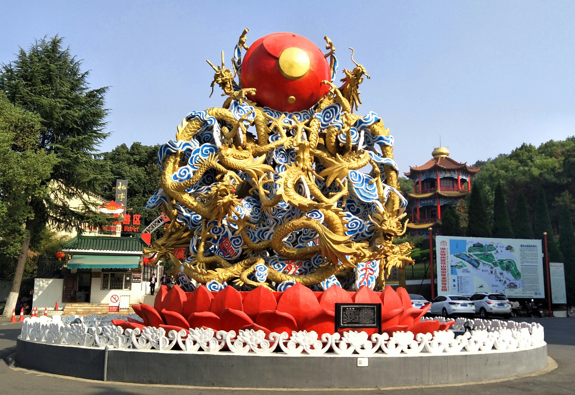 九龙坛:九条玉龙与东西南北中五方分布,盘绕拱托着巨大的莲花球,瑞气祥云,雕塑取意“九州大同”象征中华儿女团结奋斗。