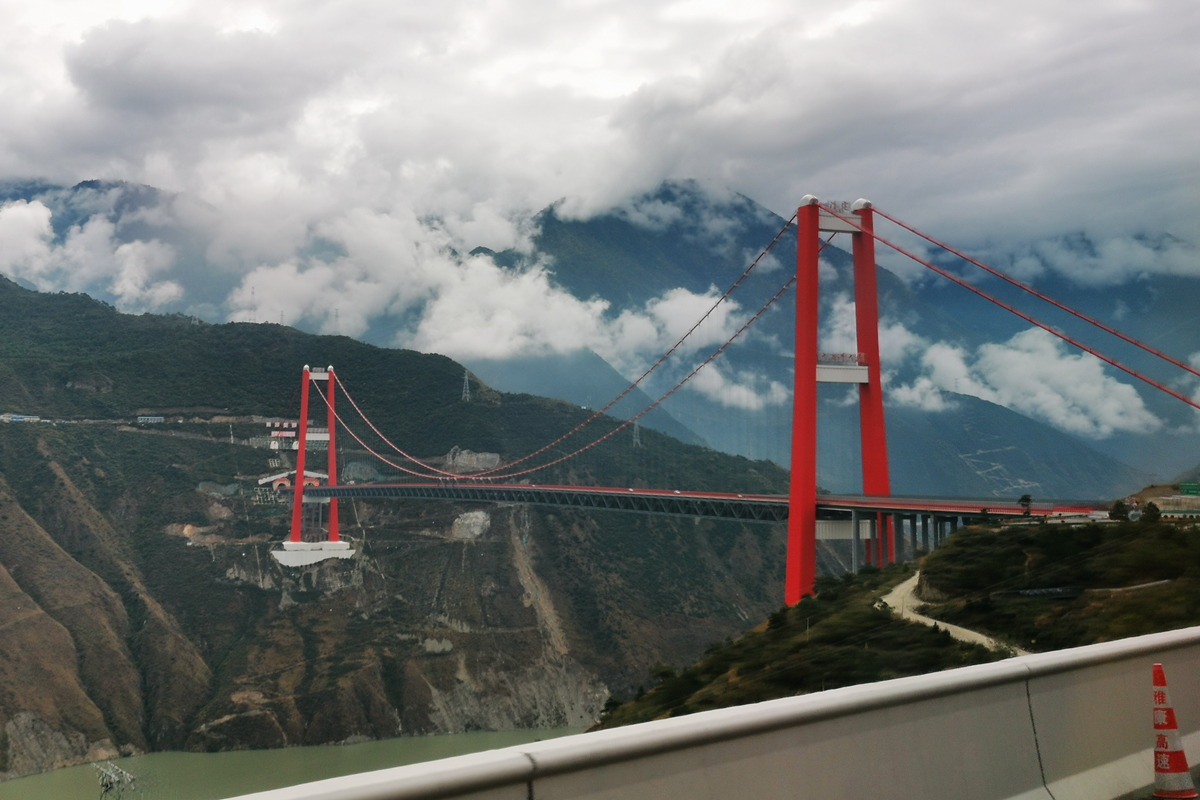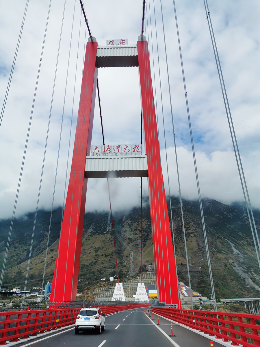 很快就到泸定大渡河特大桥,红色的桥梁的斜拉柱桥,特别雄伟壮观