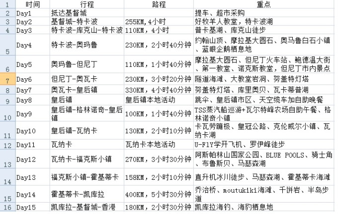 关于线路的另外一个纠结之处在于顺时针还是逆时针。更加合理的建议是从基督城逆时针去往凯库拉或者或者霍基蒂卡,沿西海岸从瓦纳卡到皇后镇,最后经过特卡波库克山回到基督城。好处是最精华的皇后镇特卡波一线留到行程最后,渐入高潮不容易产生审美疲劳。