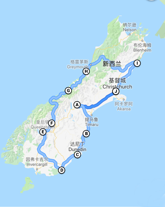 我们出发时恰逢农历初三,考虑到特卡波观星也是此行的目的之一,把特卡波安排在农历月初显然比月中更加合适,最后我们选择了一条从特卡波向南到但尼丁,再绕回到皇后镇,经西海岸回基督城的个性路线。