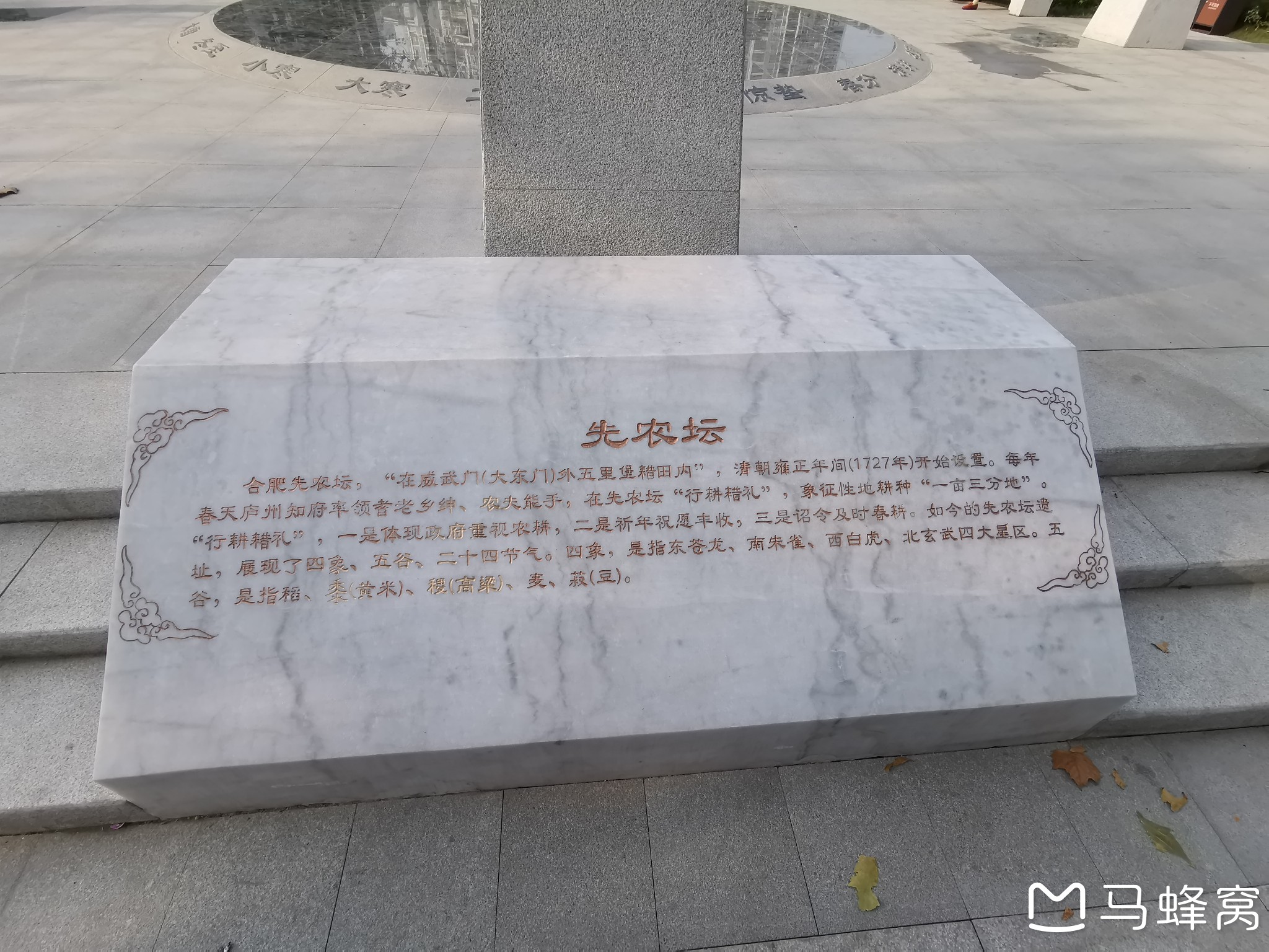 先农坛遗址上建起了东青龙、南朱雀、西白虎、北玄武(龟和蛇)四个古代方位神像,和象征东南西北中的五种谷物,东高粱、南水稻、西小麦、北大豆、中小米。从古至今,水稻都是庐州府辖区内最主要的粮食作物,自北宋以后,庐州府所在的安徽环巢湖流域主要采用单季稻或者双季稻与油菜的套种。清代庐州冬小麦种植面积也占到全部土地的约六分之一,大豆、高粱、小米本地几乎见不到种。然后还有西汉武帝时期确定的二十四节气和传说中上古时代农业鼻祖神农氏。