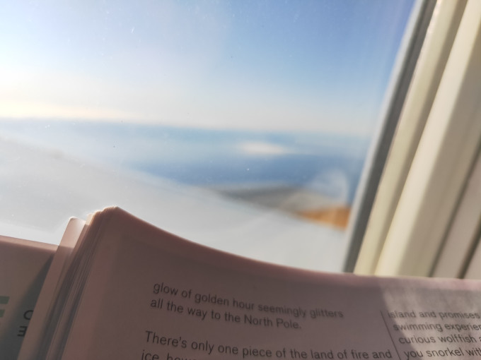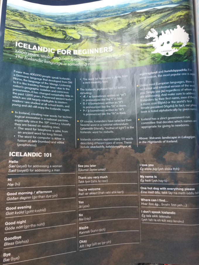 贴几张图,在飞机上我好认真的学习了冰岛语,不知道自己读出来了个什么东西,还认真的参考了旅行攻略,包括吃什么,坐在机舱左边,快着陆的时候,可以看到蓝湖冒出来的热气。