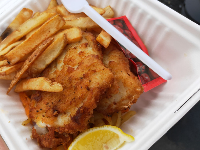 去黑沙滩的时候我还吃了炸鱼薯条,也很新鲜,但是当时我没想明白,把外带盒带去沙滩上吃,要不是我拽得紧,风要把我整个碗还有我这个人都扬了。