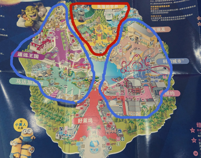 地图可以分为3大块,左边比较适合儿童,右边比较刺激也是最好玩的,上面是侏罗纪区域和表演区域。我选择了先去右边玩最期待的过山车