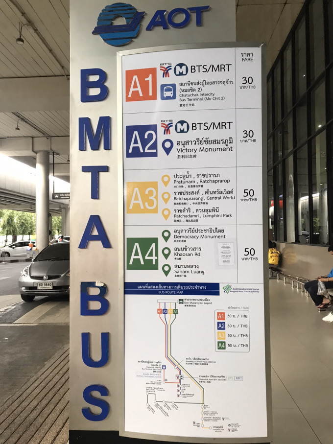 机场到市区 如果是落地廊曼机场T2 就1层找12号口 出机场找A1大巴 上车交钱 一人30B 售票员会找你钱 坐到终点站就好 终点站是BTS Mo Chit站 然后进BTS天铁站 不要进错成MRT了各位亲 我就犯了这个错误...