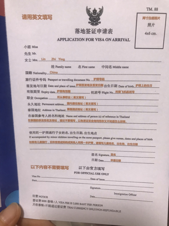 泰国现在最新消息是到2020年4月30日之前一直实行落地签免费 大家可以提前在家打好落地签证申请表 用签字笔填写好 网上有模版 贴好白底两寸彩色照片 省得到时候耽误时间出关 模版如下