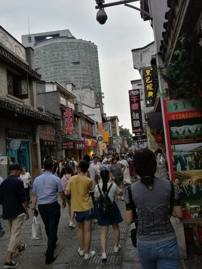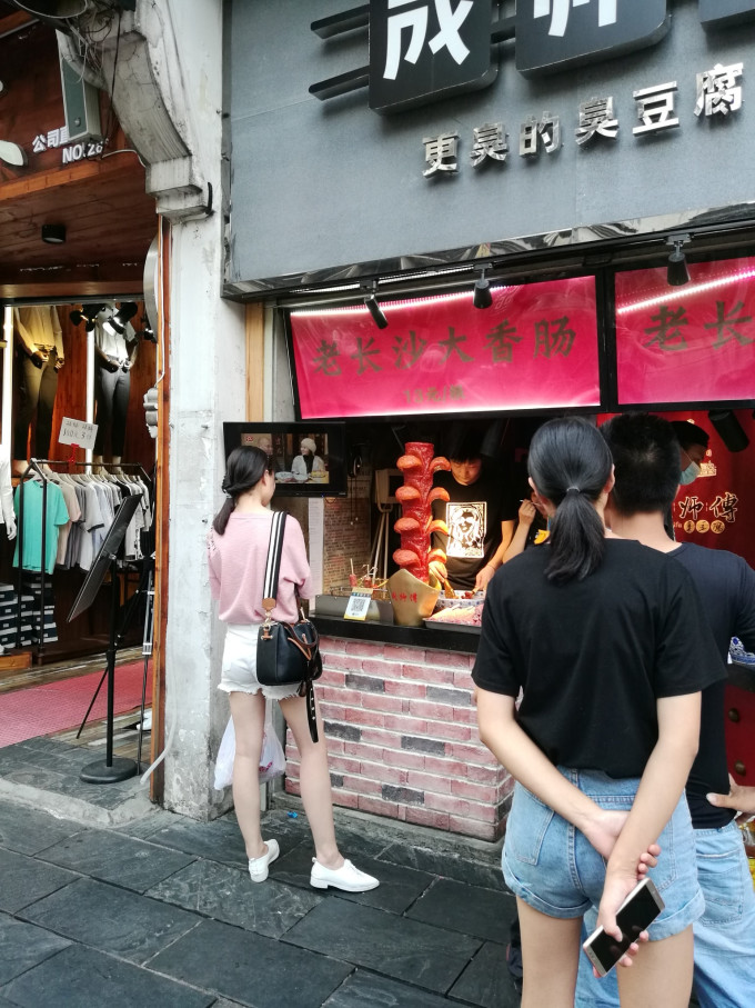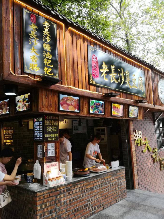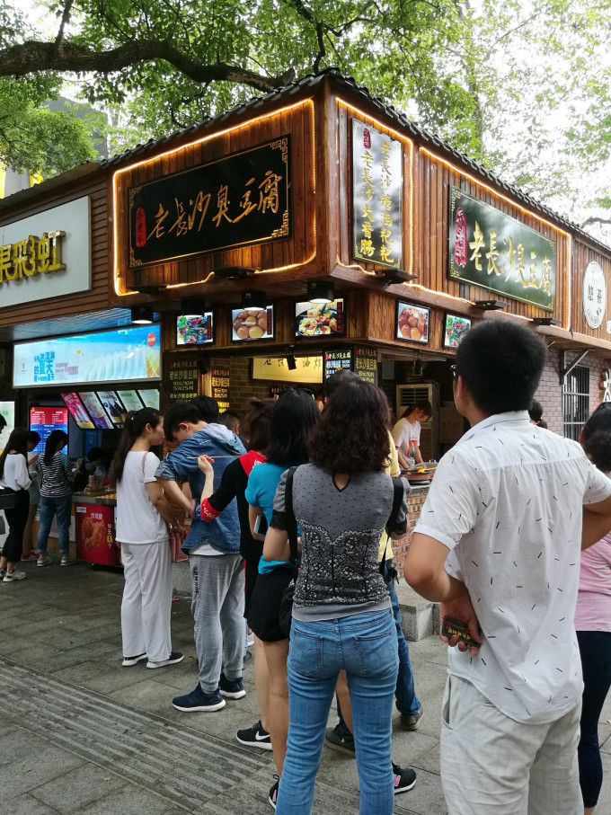 走出岳麓山,有一条美食街,我们正好饥肠辘辘,臭豆腐一人来一份。