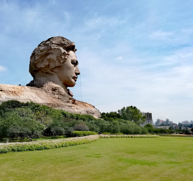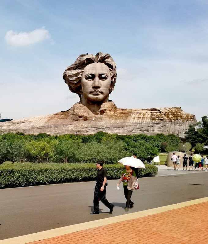 大概是为国庆节做准备,蜘蛛人正在水洗塑像。