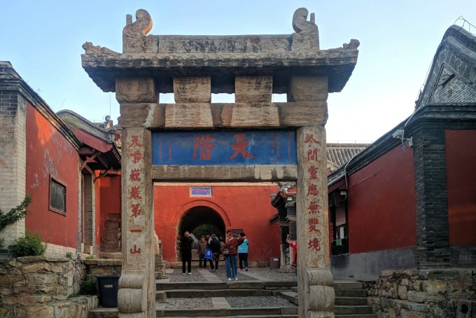 过天阶坊就是泰山著名的红门宫建筑群!红门宫是泰山古盘道起始的门户,呈半封闭凹形空间。再加宫前三重白色石坊(即一天门坊、孔子登临处坊、天阶坊)及碑碣,构成一组高低错落、色彩鲜明、形若天梯的古建筑群。