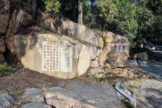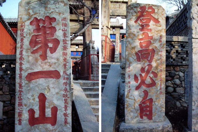 再往前是“孔子登临处”石坊,坊前左右分立“第一山”和“登高必自”碑:“第一山”碑上列了一串官员名字,不知是何人所书;“登高必自”则语出《中庸》:“登高必自卑,行远必自迩”,意思是登高一定从低的地方开始,远行一定从近的地方起步。“卑”与“碑”谐音,故只书“登高必自”。