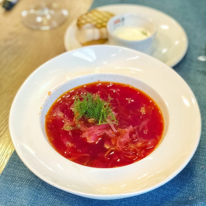 俄罗斯的红菜汤必须试一下,实践证明还可以~这个是全素的红菜汤,感觉有点涩涩的。