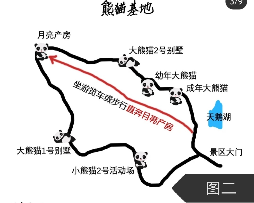注意:1.可以早点去熊猫基地,每天人比较多2.票可以自网上买3.自备干粮和水,景区略贵,线路参照图二