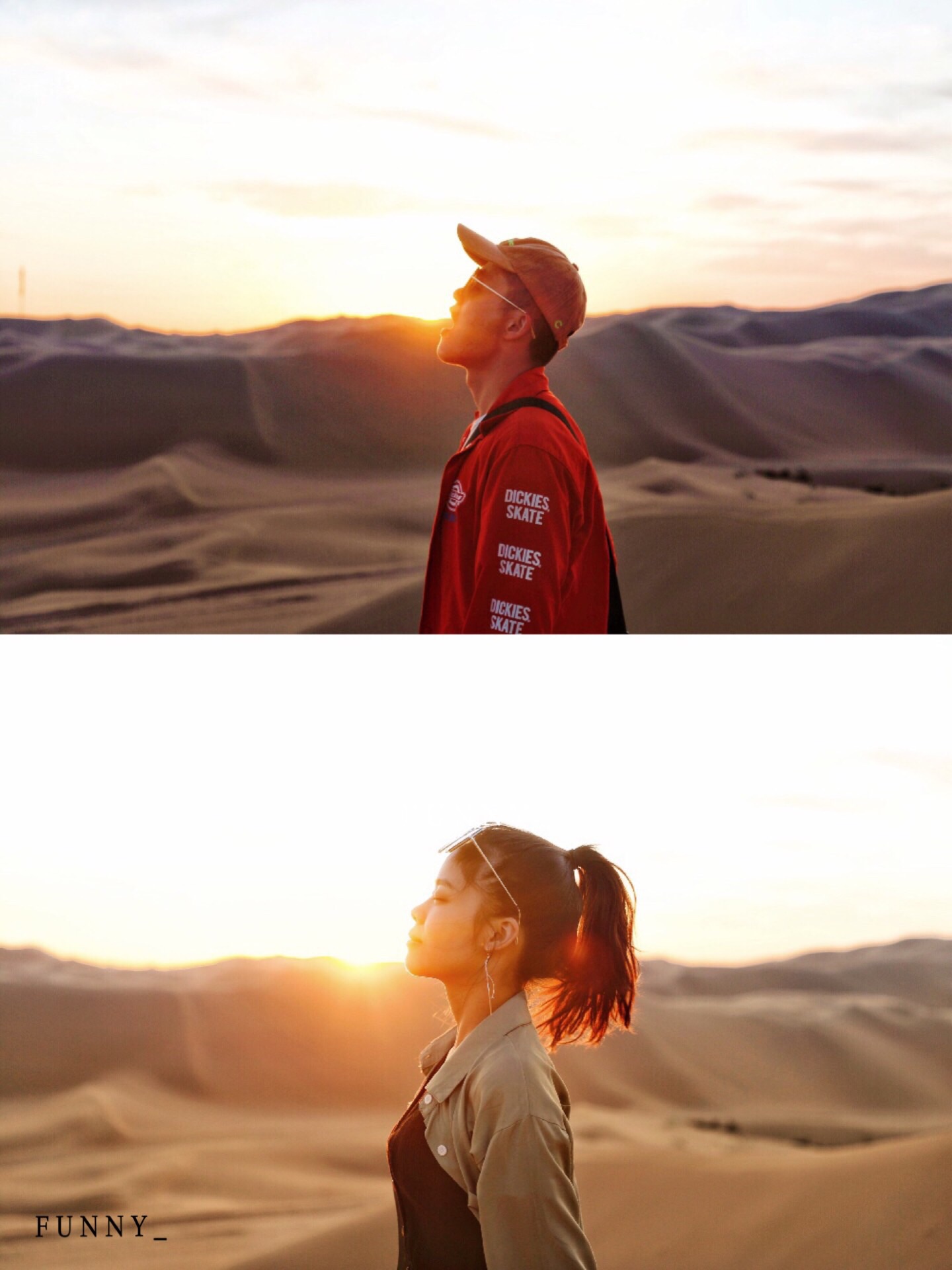 当天抵达响沙湾时已经是下午四点半,在准备买票进入时被告知娱乐设施已经全部停止营业,我们四人吹着风沙,在沙漠堆上静待日落,来了内蒙才知道,日出日落真的从不缺席;