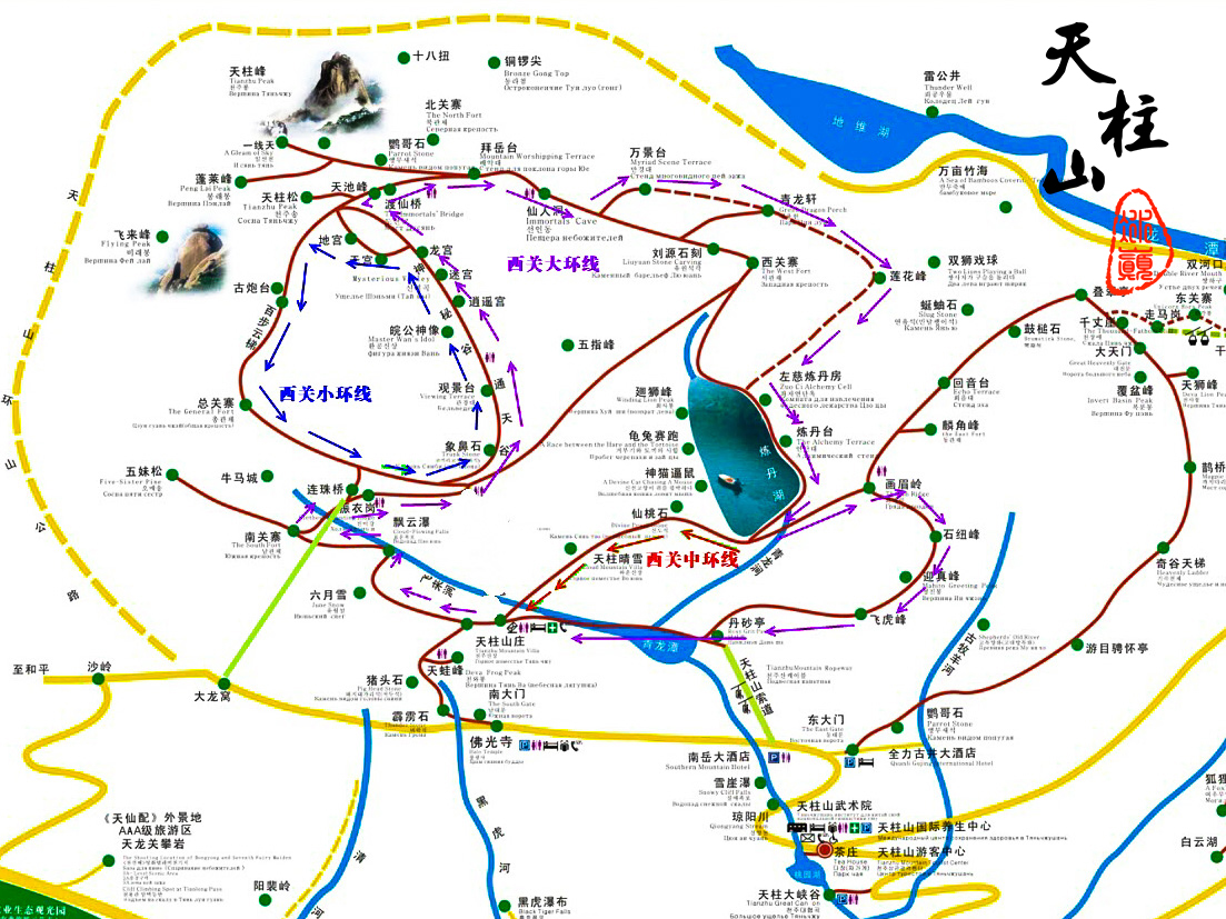 游客中心——大龙窝索道——振衣岗——神秘谷——天池峰——渡仙桥——拜岳台——蓬莱峰——天柱峰——拜岳台——天池峰——总关寨——振衣岗——大龙窝——游客中心。