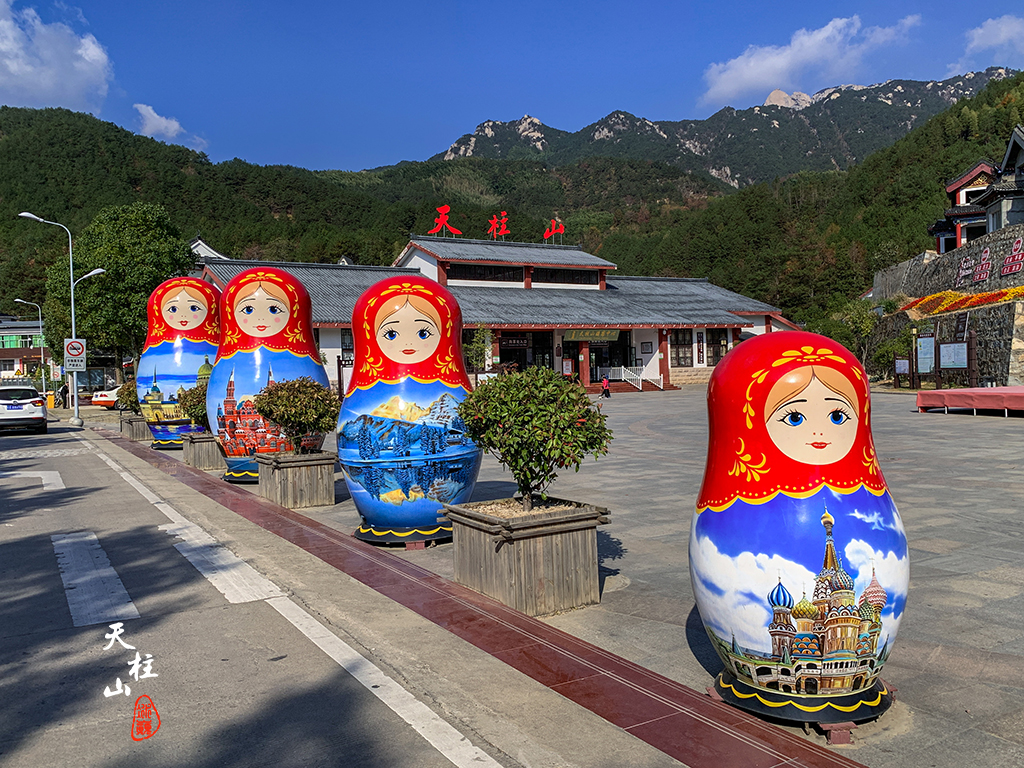 经过大概40分钟,终于来到天柱山景区。大道旁就是有名的俄罗斯套娃。天柱山下有个俄罗斯村。