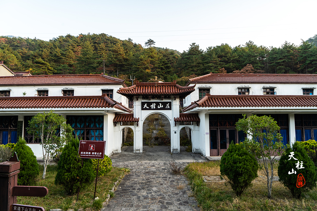 没走几步,看到“天柱山庄”的建筑物。终于到了,今天九个小时的颠簸旅程终于结束了。。噫。。。。感觉有点不对啊,这个提示牌什么鬼?山庄也太疏于管理,杂草丛生。特地上去看一下,房屋大门紧锁、空旷无人,难道山庄整体跑路了?