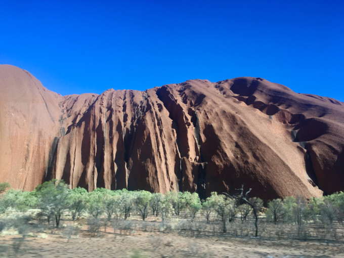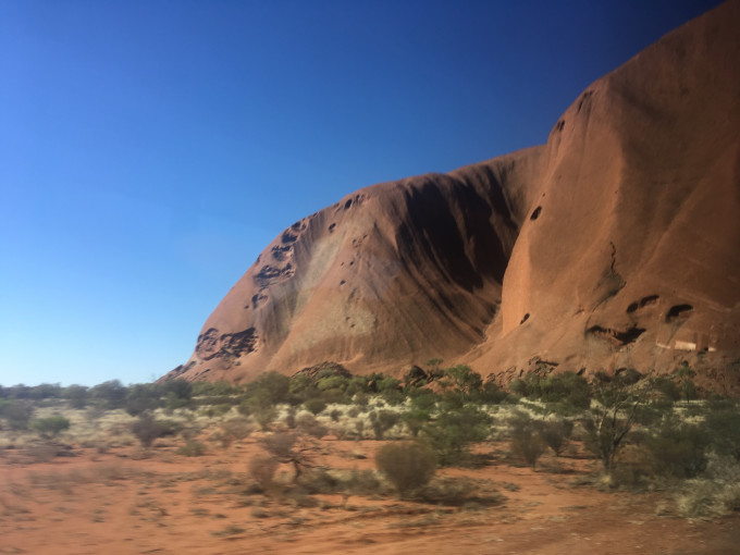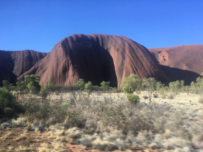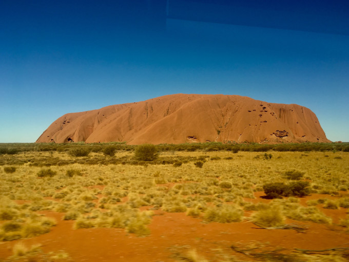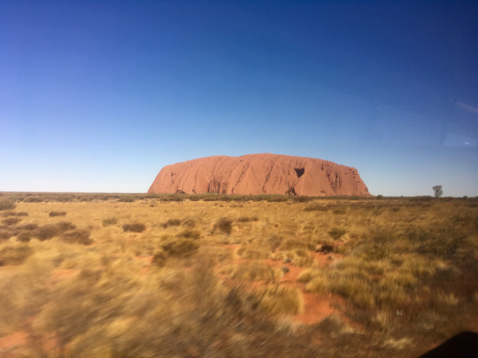 在酒店安顿好后,我们就踏上了乌鲁鲁日落之旅,这张是在旅游大巴上拍的,由于车窗贴膜了所以颜色有点夸张,但是确实等我们到了,发现下午的乌鲁鲁开始偏黄了,黄褐色那种。