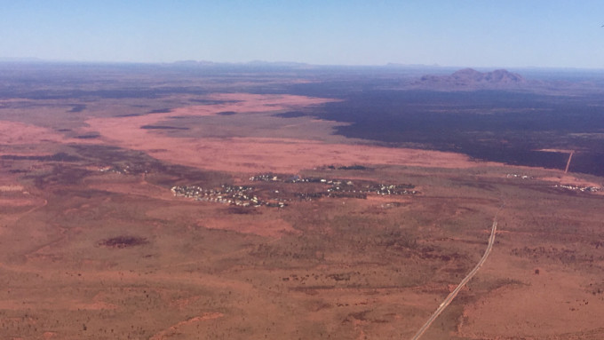 飞机降落时能看到乌鲁鲁岩,由于红土沙漠太广袤,看起来就像一块小石头,感觉不出它的宏伟。俯瞰的乌鲁鲁是比较偏褐色。