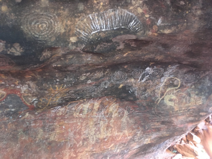 岩石上有些自然的洞穴,还有水形成的不同颜色,土著人都会想很多故事,把这些自然现象和他们想教育孩子的东西结合起来。大蜥蜴,大蛇打斗之类的,主要是为了传承家庭观和自然观。