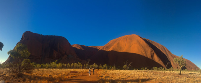 离开的时候,趁机拍了全景,特地留了两个路人,反衬出这块大石头的庞大,反正我一下车真的是被震撼到了,一整块石头就是一座大山,这还只是山的一小部分而已。这时候的颜色也比较金黄了。非常好看。导游说乌鲁鲁离地面接近350米高的时候,我好惊讶。