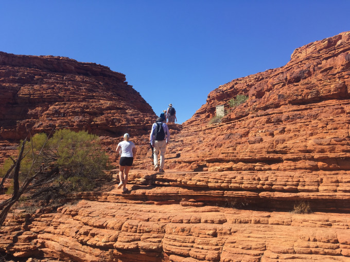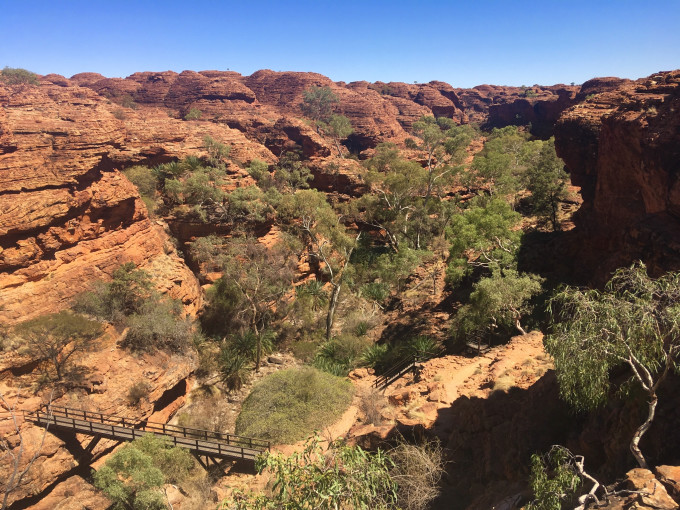 第二天一早(3.30)我们就出发去大峡谷。这么早出发是为了去赶一个很赞的路线Rim Walk。由于沙漠地区气温很高,所以这个路线9点后关闭。Kings Canyon里Uluru要三小时车程,离Alice Spring也差不多,所以从这两个地方出发都要早起。