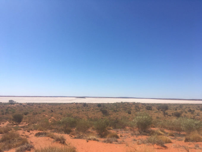 这是另一个大石头,被当地人戏称为Fooluru,因为有很多游客自驾游,就以为这个是乌鲁鲁,然后错过了真正的乌鲁鲁。这就在盐湖对面,有个观景台,观景台对面的红土坡上可以看到两边的景色。这石头超级平,好规整,感觉像个蛋糕。