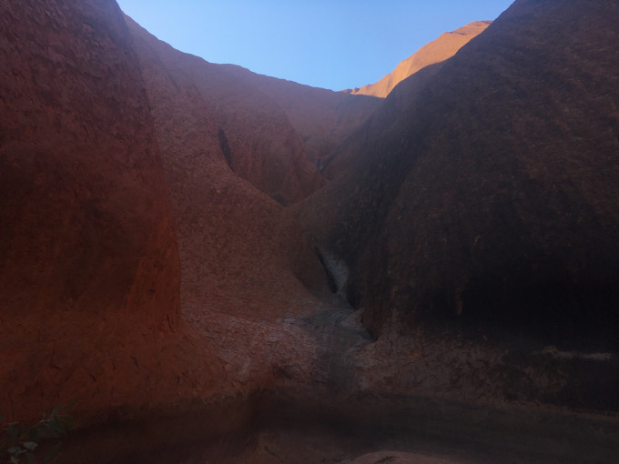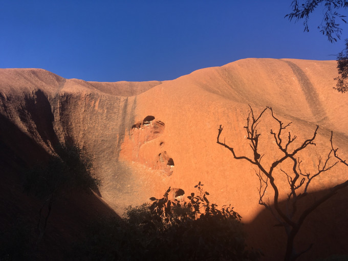 乌鲁鲁出名的都是正脸照,其实环顾乌鲁鲁一周才发现这块大石头变化多端,非常有趣。这里是背光面,所以为了拍清楚石头,天被曝光得有点假,哈哈。接下来有一段是不能拍照的,但有很多非常有趣的造型,大家有机会自己去亲自欣赏吧。
