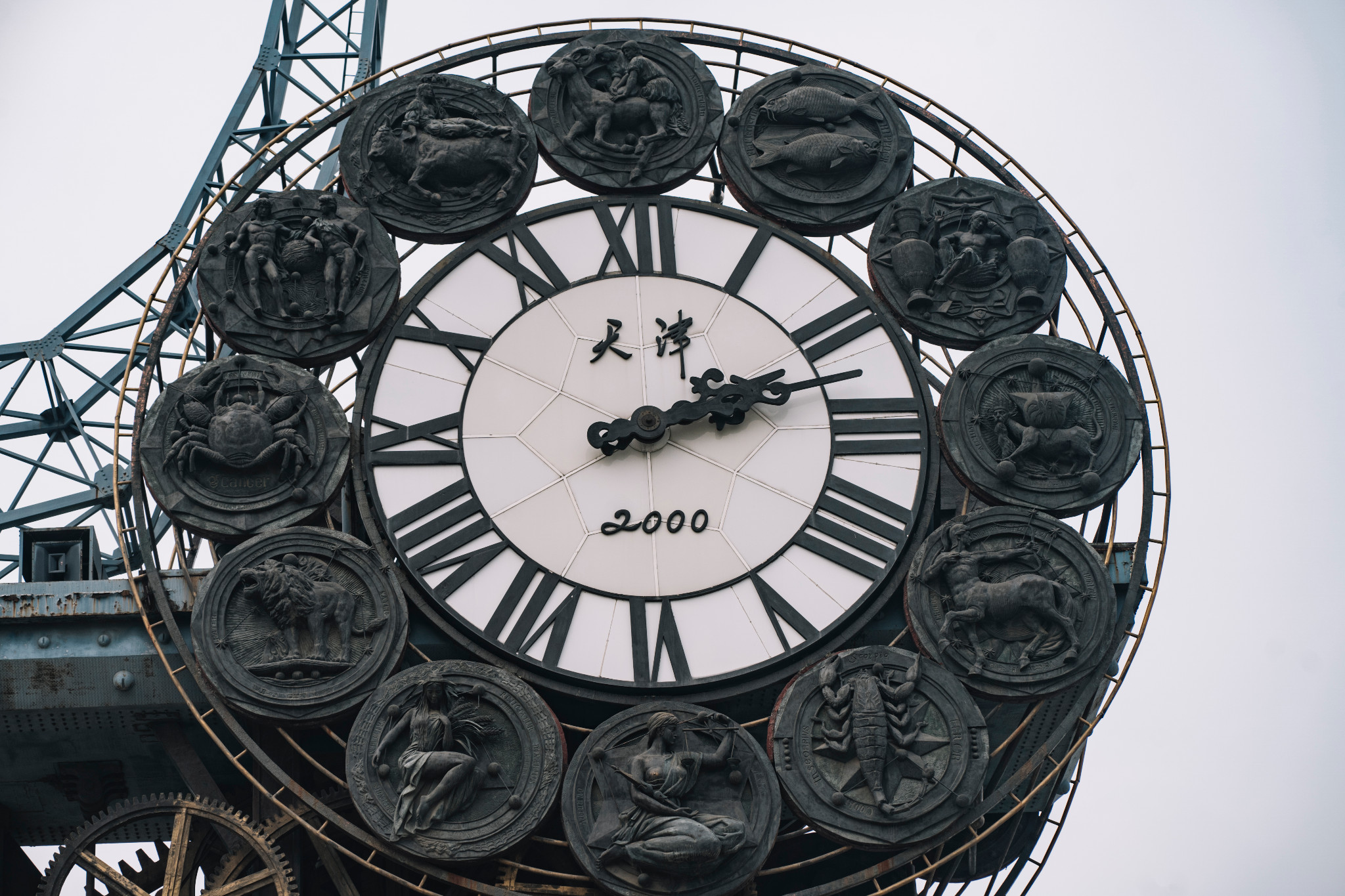 钟表是全金属材料构筑而成,在钟表面镶嵌着十二星座的青铜浮雕,长杆、齿轮、底座构成了一个完美的时空造型,它标志着天津这座老工业城市在历史的进程中已经又前进了一大步
