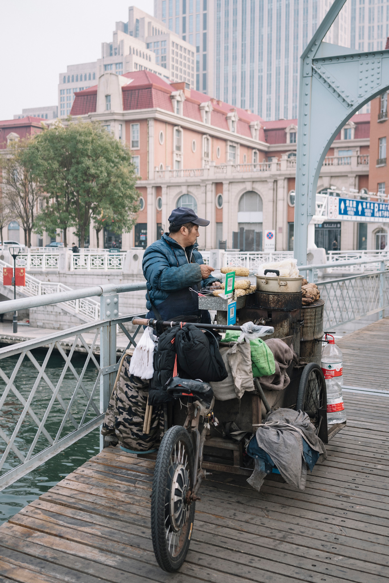 如今不一样了,幸运的话也许还能碰上在解放桥中间趁着红灯停的空当拍婚纱照,年轻的情侣在桥上自拍,卖小吃的大爷在桥头摆摊儿,这就是现在的天津