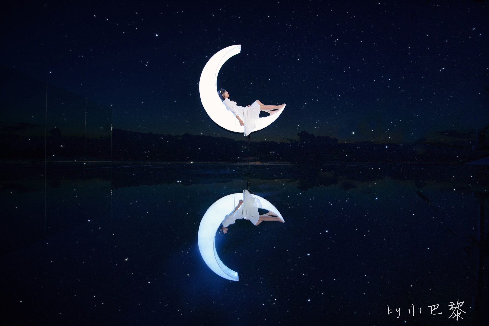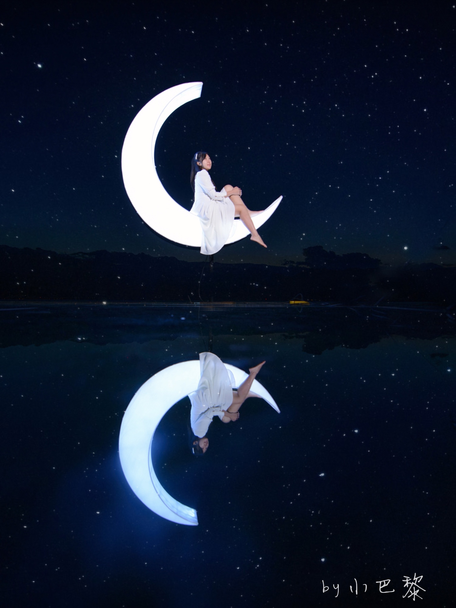 建议傍晚天空还没有黑透的时候拍,穿搭建议浅色系、白色系,深色会看不出来。