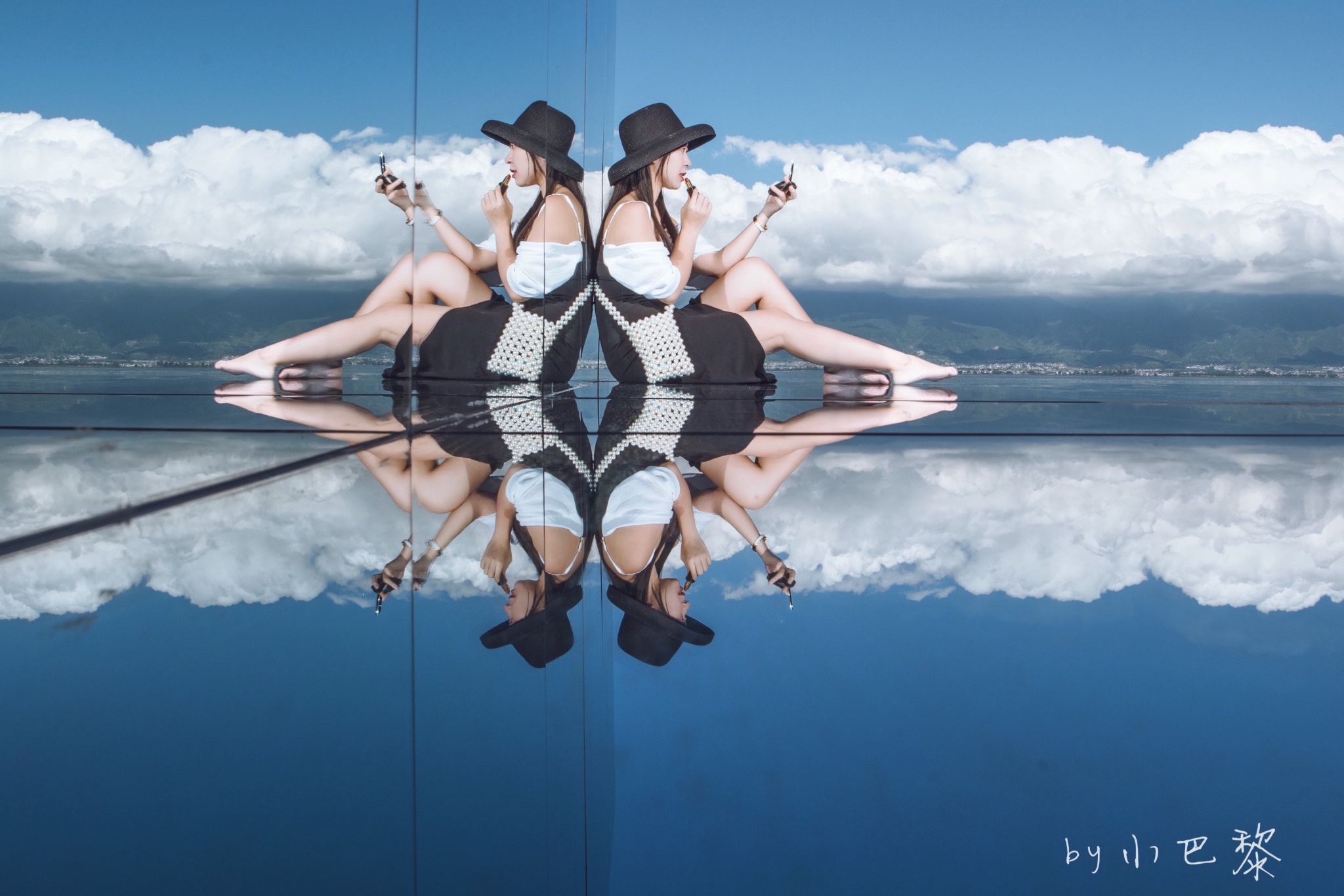 大家都穿红裙和白裙在天空之境拍照,那么我就穿黑裙吧!