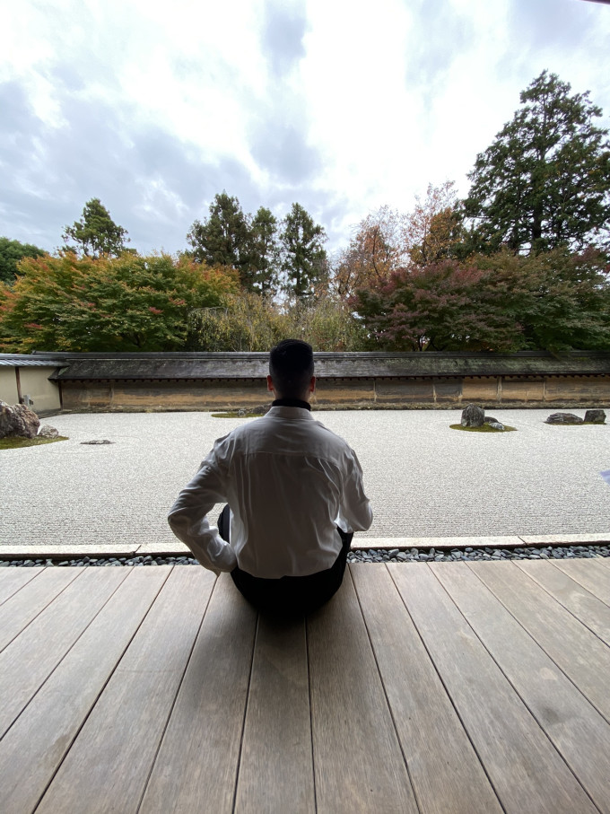 这里就是“龙安寺”里有名的“枯山水庭院“,大家都会在这里坐一会好好看看庭院的风光,虽不及京都有名的”清水寺“但我个人感觉这里更适合欣赏日本庭院的风光,感受下扑面而来的禅意。赤脚走在木板的走廊上,别有一番滋味~