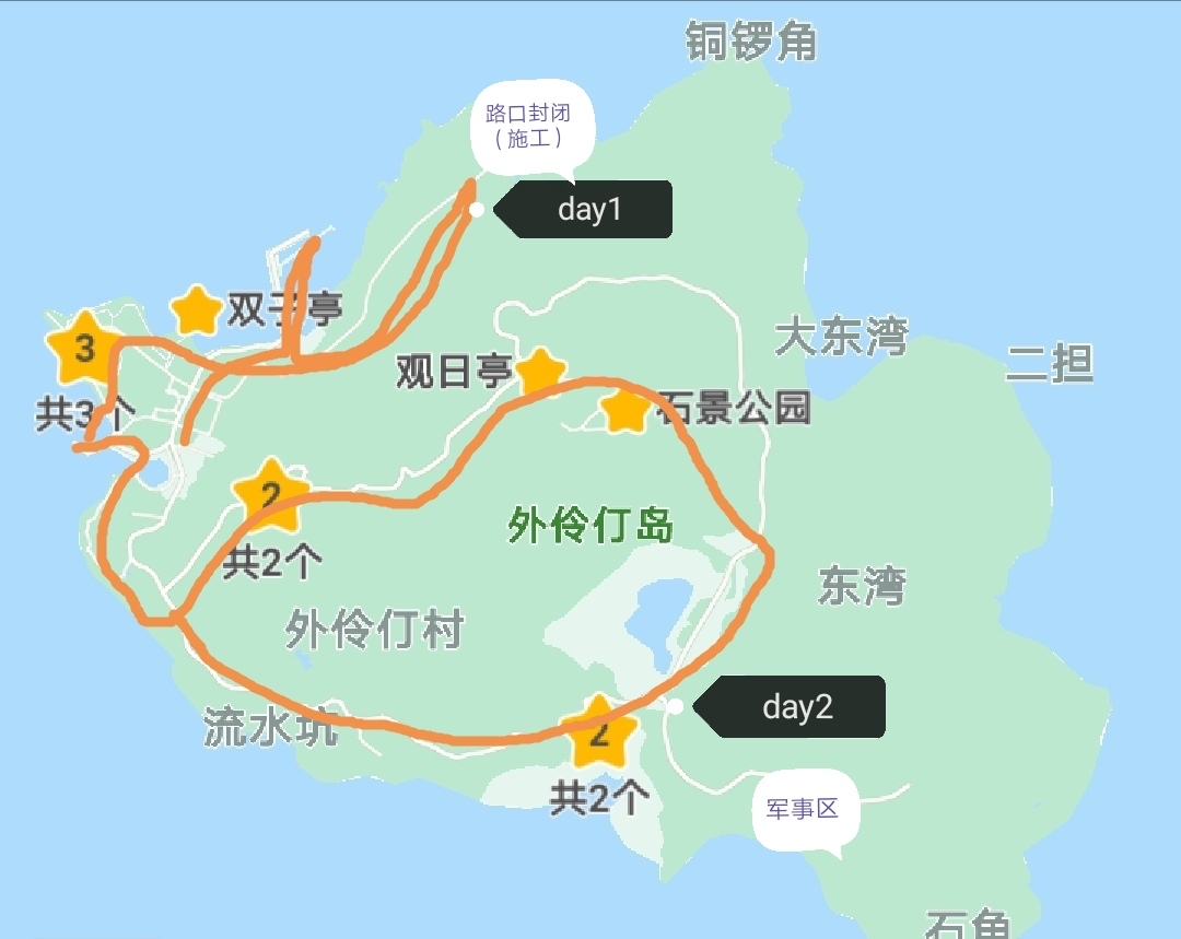 计划第一天走西南线,爬伶仃峰,经塔湾返回港口,第二天走西北线,经大东湾返回。