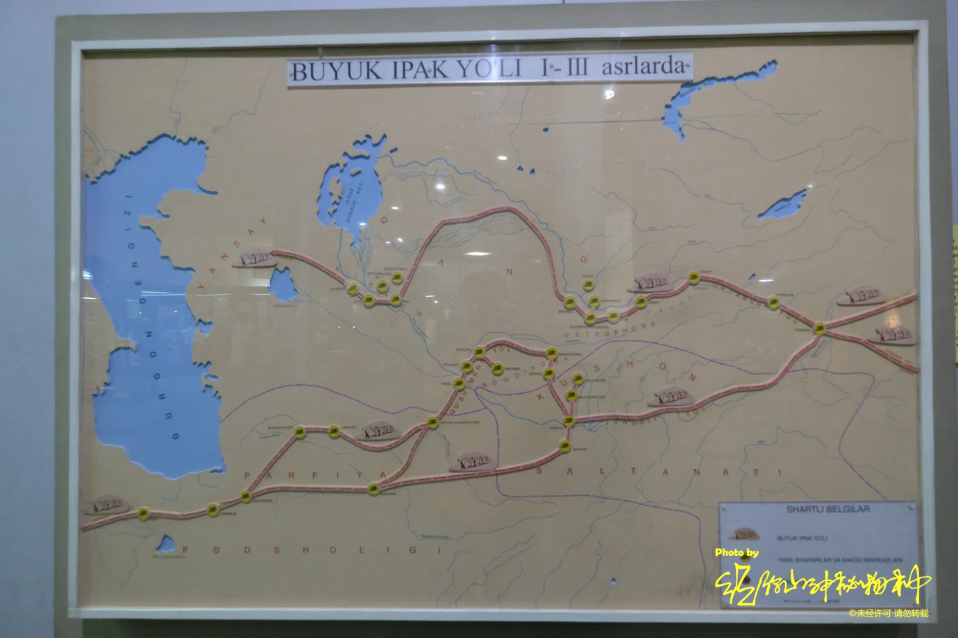 这个图是丝绸之路中亚段,时间大约是我国汉代,似乎每个国家都喜欢把自己国家的城市标注为丝路上的重要节点,乌兹别克也不例外。但是总体上看,北道绕过戈壁到达花剌子模,南道经过阿姆河的绿洲城市撒马尔罕和布哈拉,经过土库曼到达伊朗马什哈德,再向西进入土耳其,中亚段的丝路在国内比较少见到介绍。