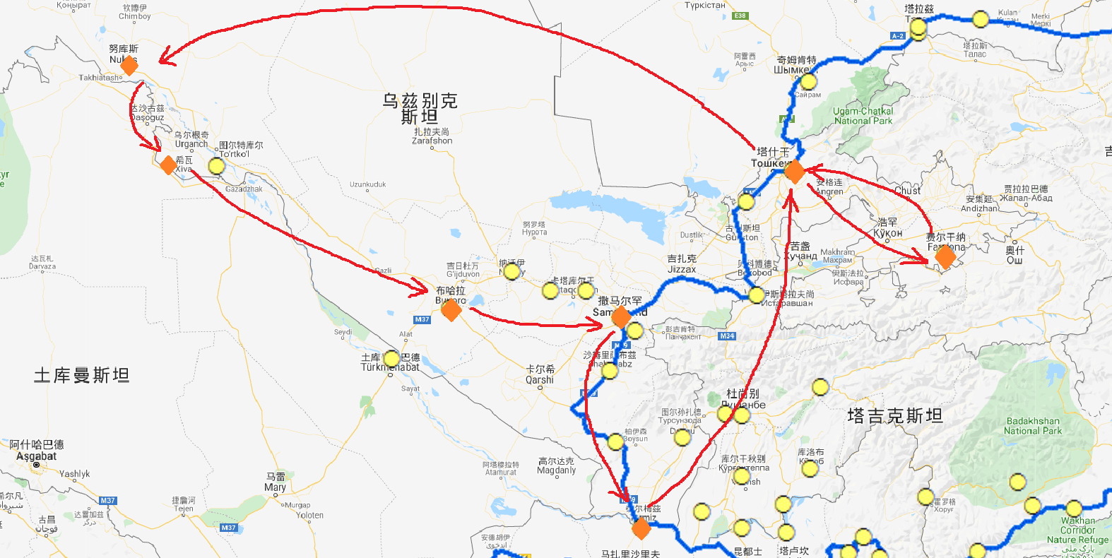 虽然现在乌兹别克斯坦已经是出签率接近100%的电子签,但是由于无法自驾,公共交通比较难安排,尤其是城市之间的大交通,所以确定行程还是花了不少精力,最终确定的是下面的样子,一共16天。