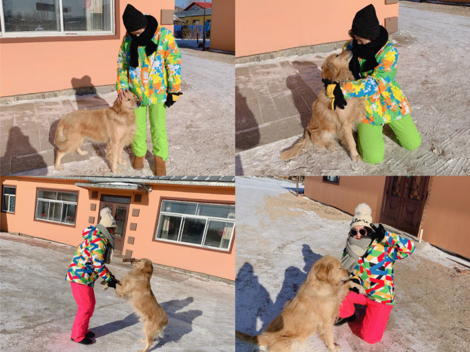 雪鼎山庄是姐弟俩经营的,提供开车接送我们去滑雪场、帮我们买票服务,最喜欢他家的这只金毛狗,很温顺很可爱,连最怕狗的蔓妹妹对它又搂又抱,也许是七八岁年纪大了已经不是很活泼了。