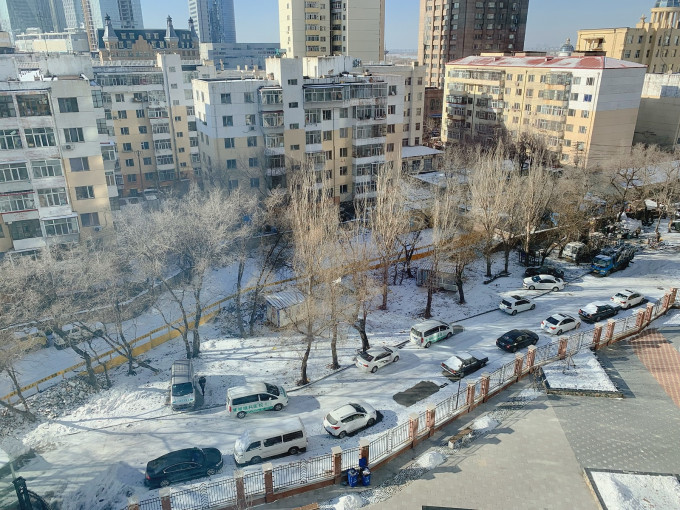 哈尔滨前两天应该刚下过雪,我们一边拖着行李箱一边在雪上踩踩跳跳像个小孩没见过雪似的,这里的雪像个假的像面粉,对,就是所谓的干雪,我们江苏的雪就是湿答答的。手戴着手套,一刻都不能拿出来,不然手真心的一秒冻僵。